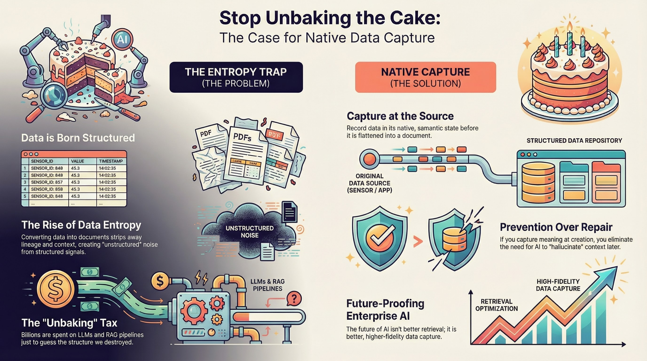 The GenAI industry spends billions trying to reverse-engineer structure from documents. But data is born structured — it only becomes “unstructured” when we compress it for human consumption. The solution isn’t better RAG. It’s better capture at the source.